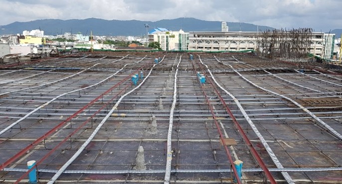 โรงแรมสูง 7 ชั้น 79 ห้องพัก (ดาดฟ้า) โครงสร้างพื้นระบบ Post-Tensioned (Bond System)